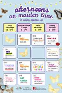 Starting Friday, January 9th, join us for FREE, weekly programming on the Eastern block of Maiden Lane in Union Square. You can expect fun activities such as junk journaling with @sfjunkjournalclub , a Charm Crawl to customize your very own Italian-inspired charm bracelet, and live salsa with @charmedinsf , to name a few. Programs are welcome to people of all ages! Click to view our monthly activation calendar.